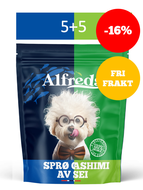 Både "Alfreds Sprø Chips av sei" og "Alfreds Dried Sashimi av sei" er laget av 100% villfanget norsk sei fra kalde, klare farvann langs norskekysten. Ingen tilsetninger. Bare ren sjømat, tørket innendørs på en skånsom måte for å bevare smak, lukt og næring. Gir deg tørre, rene og lommeklare godbiter som hunder elsker.